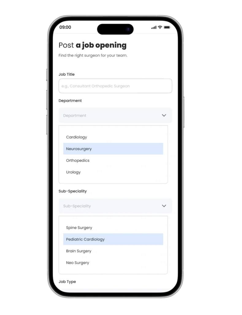 A dedicated platform for surgeons and healthcare recruiters, minimizing irrelevant job postings and maximizing relevant opportunities.